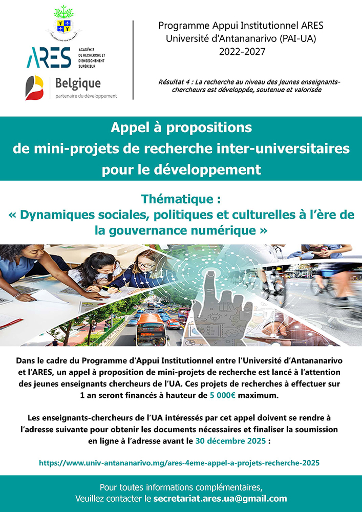 Dans le cadre du programme ARES, trois thématiques prioritaires, alignées sur celles de l’Université d’Antananarivo et de celles du Ministère de l’Enseignement Supérieur et de la Recherche Scientifique - ont été proposées pour la période 2022-2025 et ont donné lieu à trois appels consécutifs :